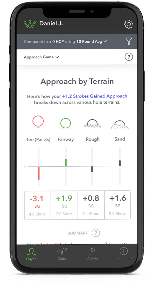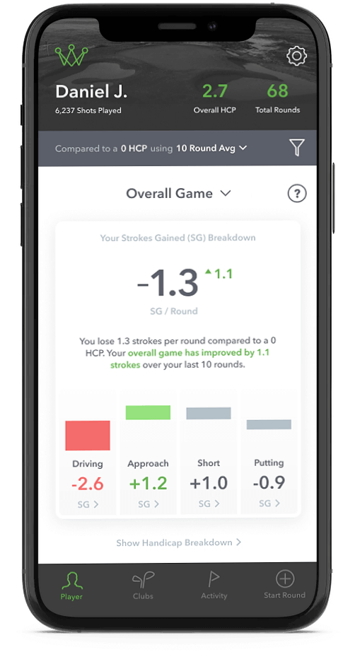 Accordingly, SGA is the first platform to allow a player to select any target handicap–from Tour player to 20–and measure their performance versus that goal across every game facet. After selecting a target, Arccos Caddie SGA will show a player’s overall game stats with trend and scoring analysis.