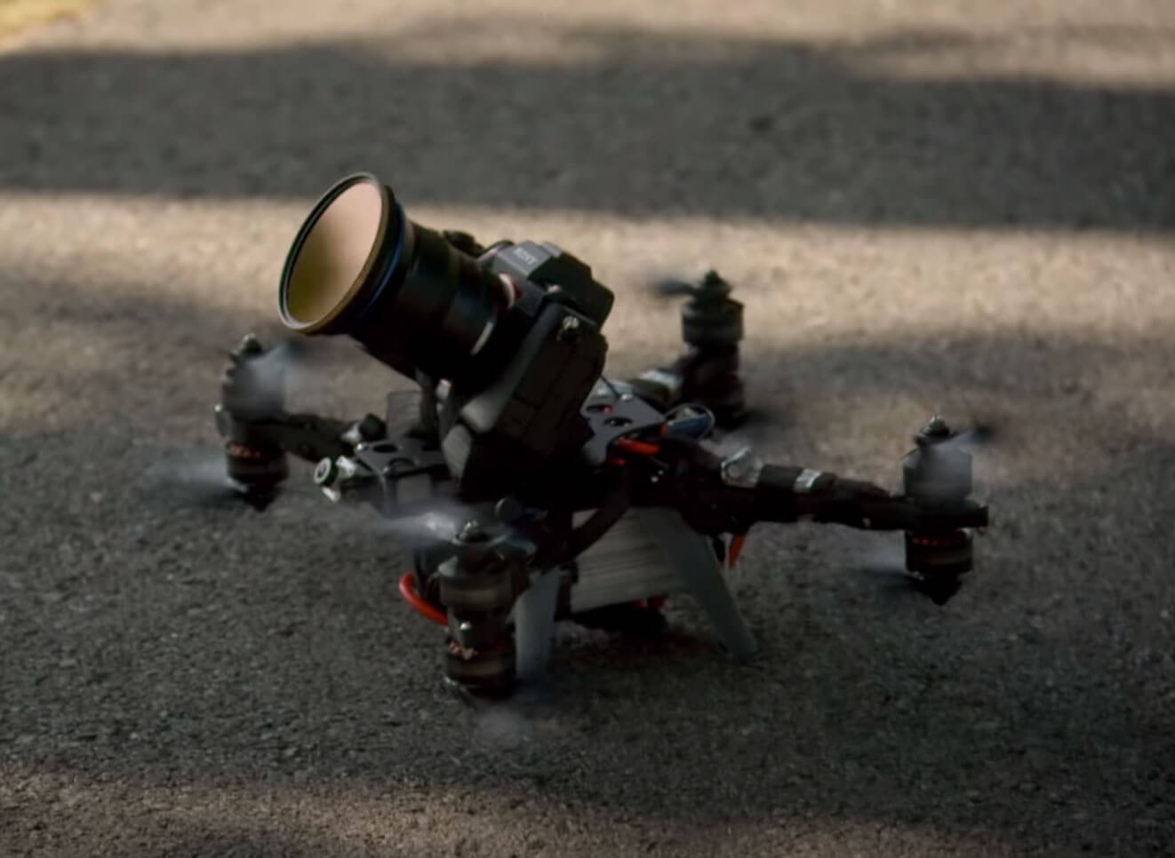 And as you can see in the behind the scenes video, this was not your average FPV drone, but instead a custom-built unit with a beast of a camera strapped to it.