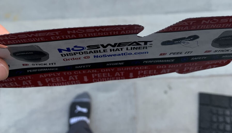 NoSweat Hat Liners are disposable liners and sweat absorbers that stick on the inside of any hat (as well as caps, masks, or helmets). Essentially, each NoSweat liner has an adhesive side, like a sticker, that you then line up with the front of the hat: