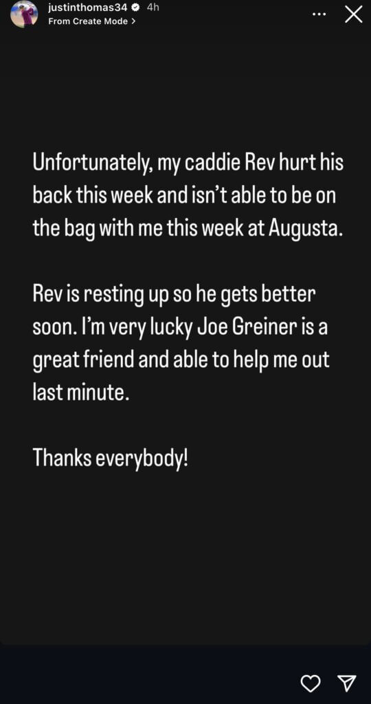 “Unfortunately, my caddie Rev hurt his back this week and isn’t able to be on the bag with me this week at Augusta. Rev is resting up so he gets better soon. I’m very lucky Joe Greiner is a great friend and able to help me out last minute.”