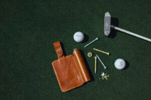 Hats, crewneck sweatshirts, tee shirts, golf tees, and a custom leather flask highlight the collection.