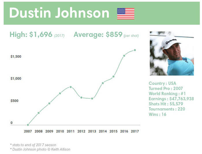 Over his career (2007 – Present), he’s averaged $859 per shot. 2017 was his most successful season to-date, winning four times in 20 starts. That works out to a staggering $1,696 earned per shot. But DJ has been pretty good over the past three seasons. In fact, since 2015, he’s earned over $20 million dollars while taking just over 16,000 swings of a club. That works out to $1,461 per shot.
